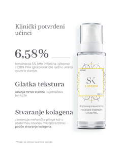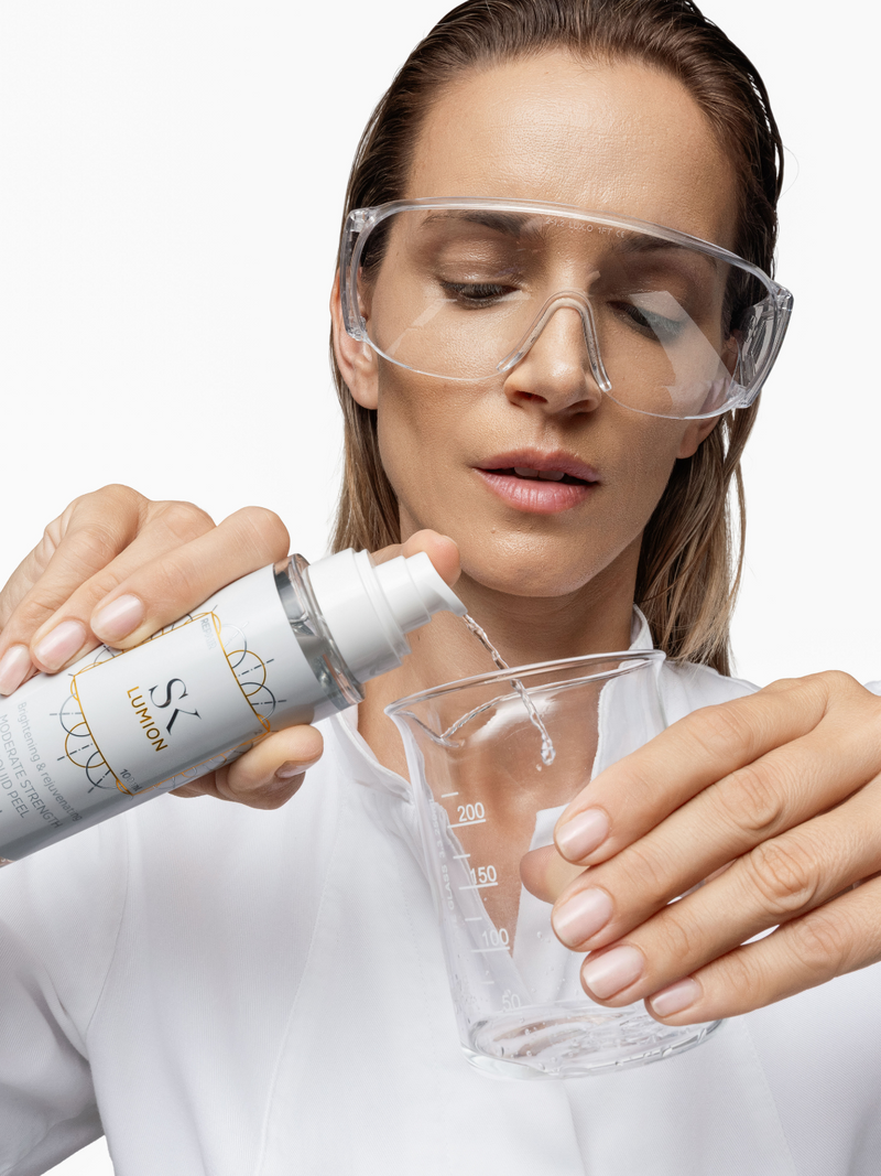 Skintegra Lumion basiert auf einer Kombination aus 5% AHA-Säuren (Milch- und Glykolsäure) und 1,58% PHA-Säuren (in Form von Gluconolacton) und entfernt effektiv abgestorbene Zellen der Oberflächenschicht der Haut, macht raue Haut weich und bringt ein neues, gesünderes Aussehen zum Vorschein Teint und gleicht Hyperpigmentierungsunregelmäßigkeiten aus.
